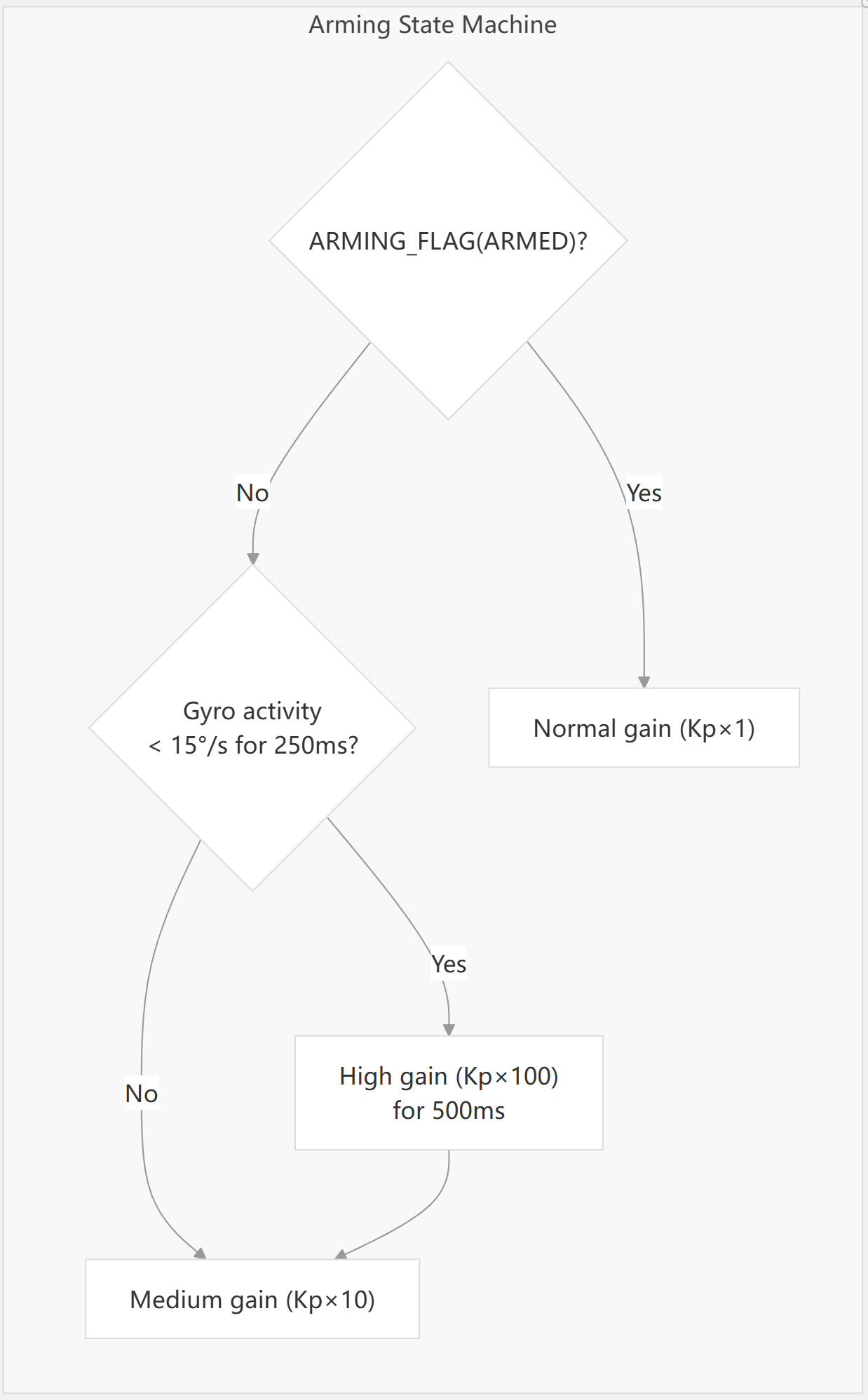 该imuCalcKpGain()功能根据武装状态和飞机运动情况调整校正增益: