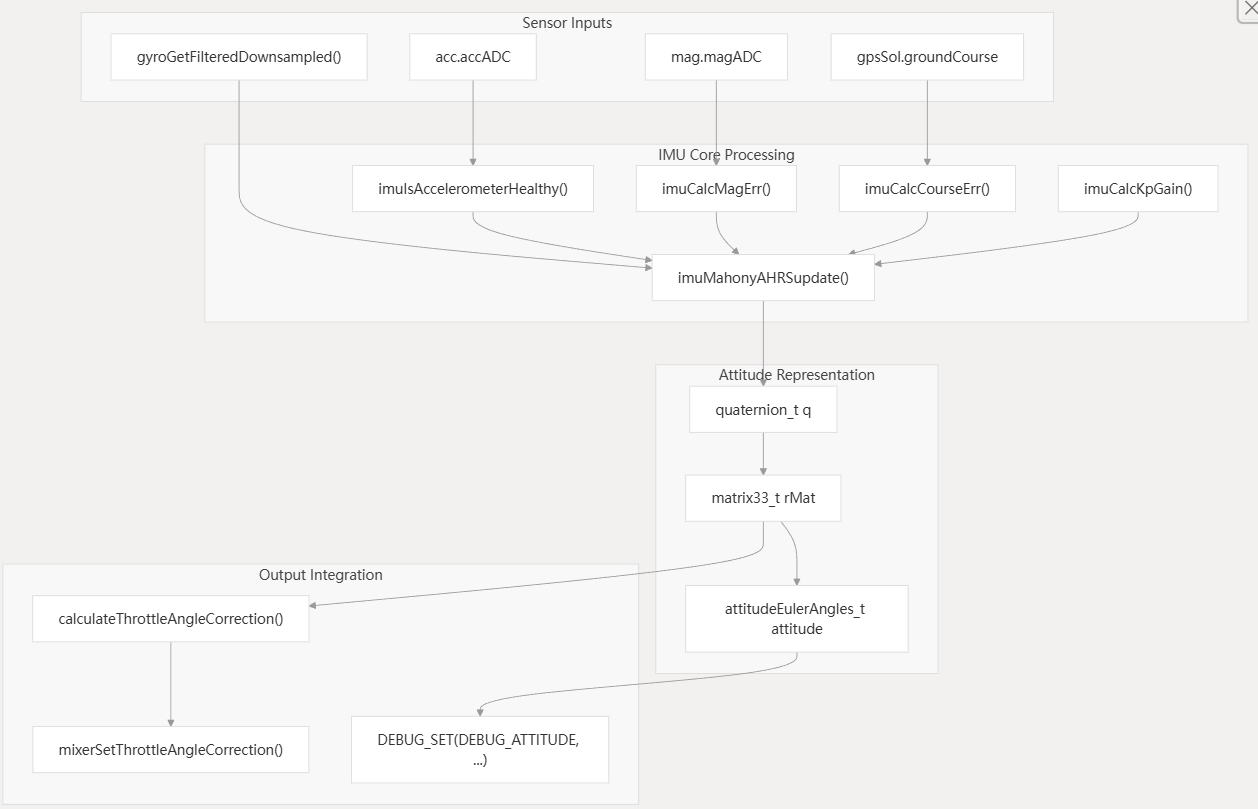IMU系统作为一个传感器融合引擎,将多个输入源融合起来,生成可靠的姿态估计。核心处理在主飞行控制回路中以高频(通常为1-8kHz)进行。