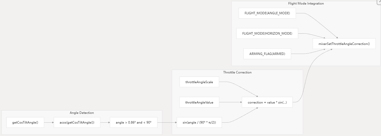 在角度模式和水平模式下,IMU 会计算倾斜姿态的油门补偿:
