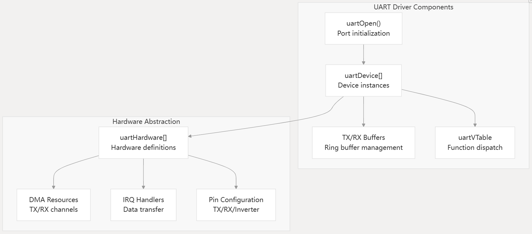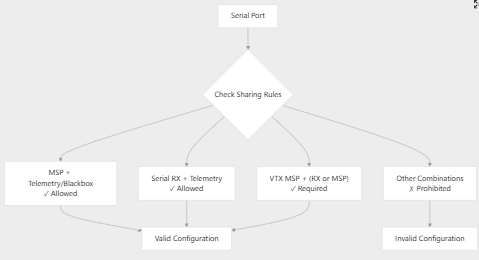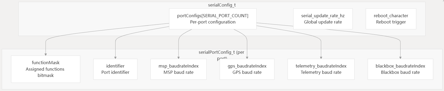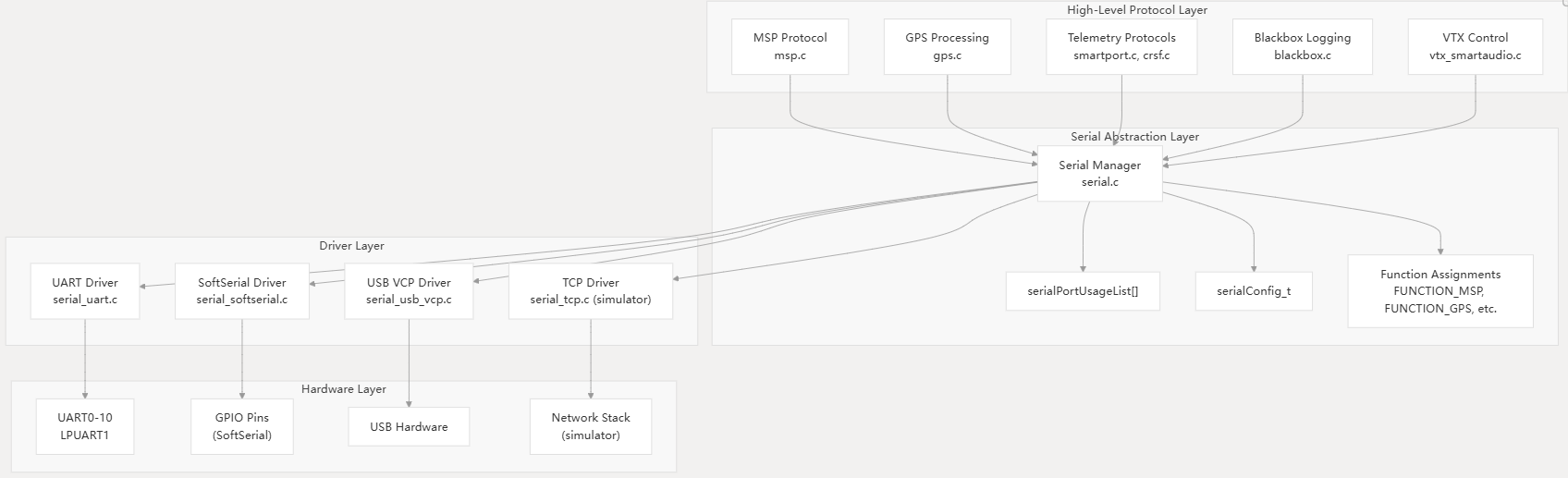 Betaflight 的串口管理系统为管理多个串口通信接口提供了一个统一的抽象层。该系统负责端口分配、配置和共享机制,并为包括 MSP、遥测、GPS 和其他基于串口的功能在内的各种通信协议提供一致的 API。