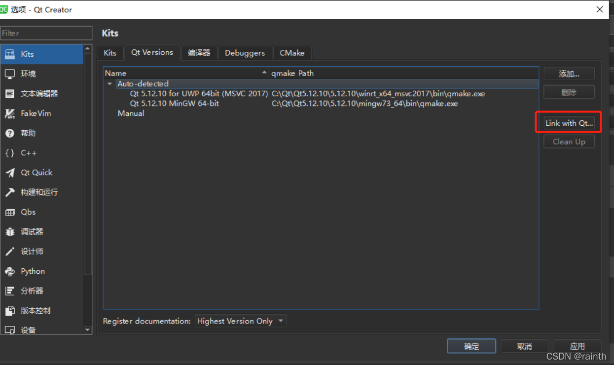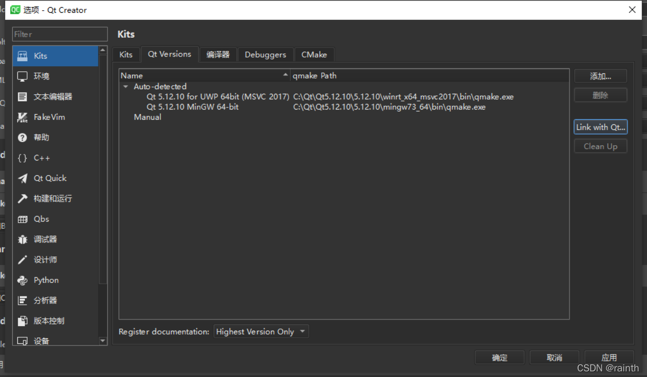 说明:qt creator只是用于winform开发的,那么编译链接是需要有sdk的,在qt creator里叫kits。
