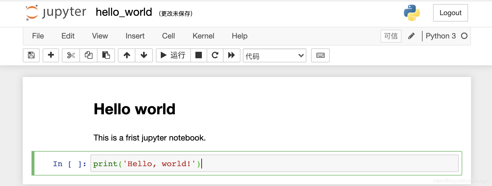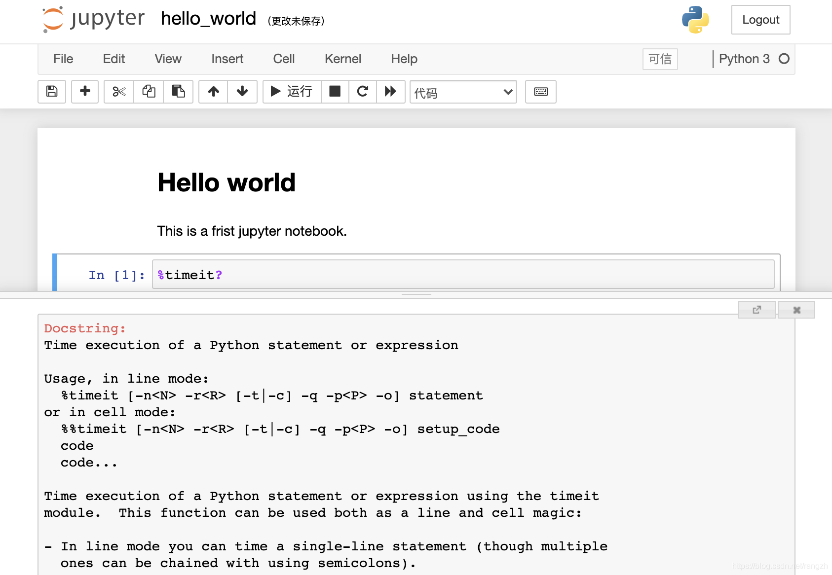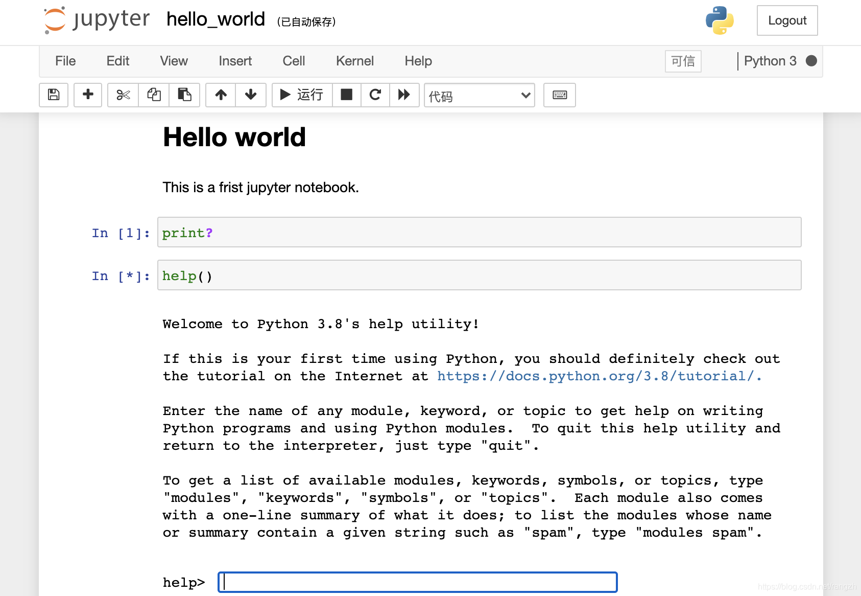 以上就是jupyter notebook的主要界面,很简单。下面重点介绍文档界面的操作。
