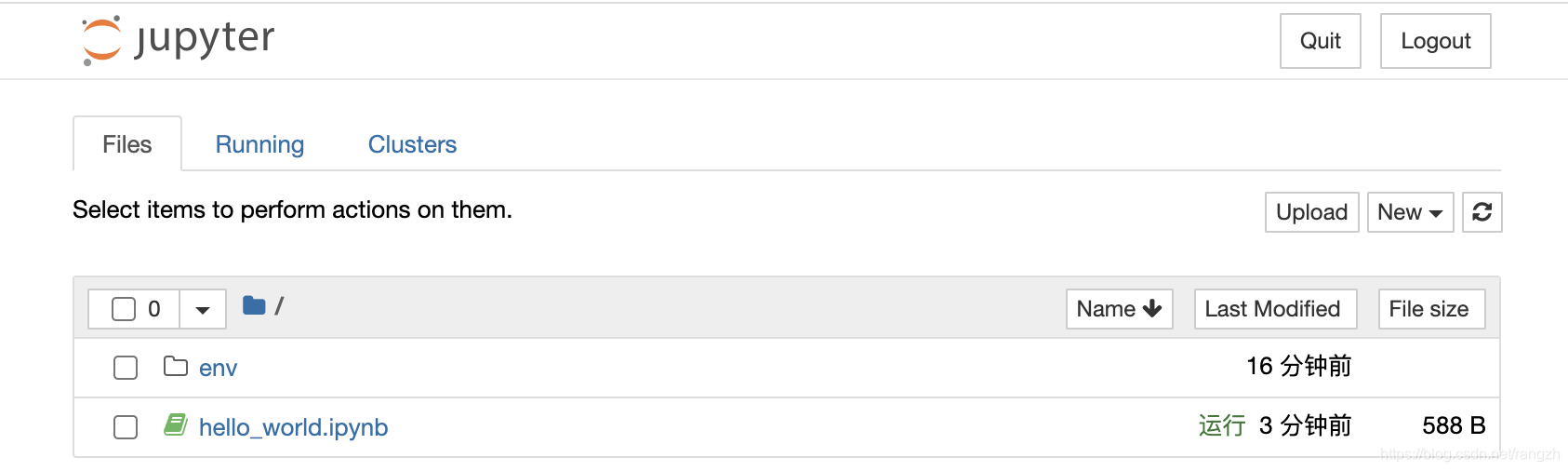 修改并保存文档后,再回到主界面,可以看到在Files标签里面多了一个hello_world.ipynb文件;而在Running标签则多了一个运行中的文档。