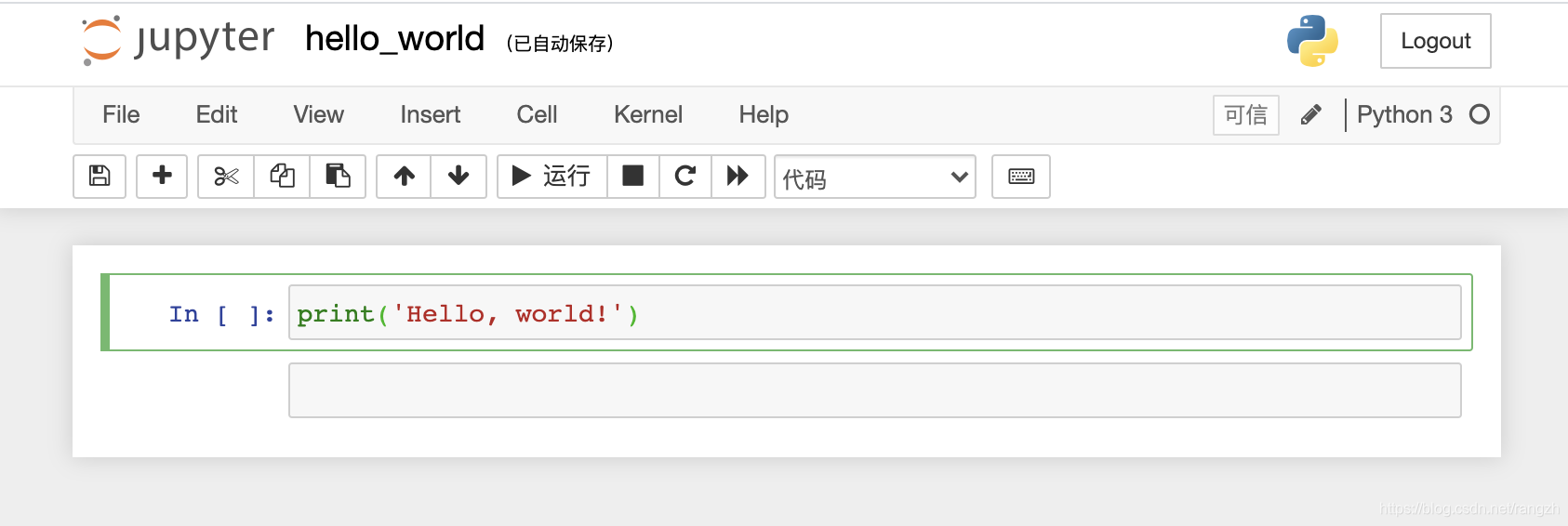 cell是一个jupyter notebook文档的基本组成单位,一个文档可以有一个或者多个cell。前面的截图中输入的hello world代码地方就是一个cell。cell有两种模式,编辑模式和命令模式。处于编辑模式时,cell中有光标闪烁,并且菜单栏右侧有编辑图标。快捷键esc可从编辑模式变为命令模式;在命令模式下按下enter则切回编辑模式。