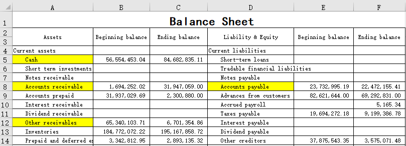 现在需要从各表中提取Cash、Accounts receivable、Other receivables、Accounts payable 等4项的Endingbalance(期末余额)数据进行财务分析,在不同表中这4项的单元格位置可能不同,需要按项目名称去查找。