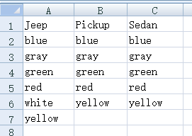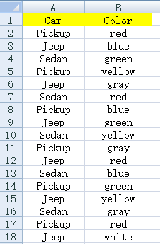 Excel文件book1.xlsx有两列Car和Color,部分数据如下图所示: