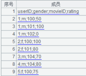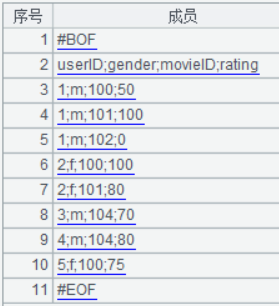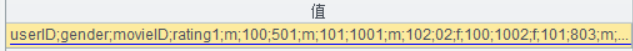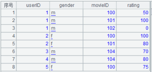 #BOF userID;gender;movieID;rating 1;m;100;50 1;m;101;100 1;m;102;0 2;f;100;100 2;f;101;80 3;m;104;70 4;m;104;80 5;f;100;75 #EOF
