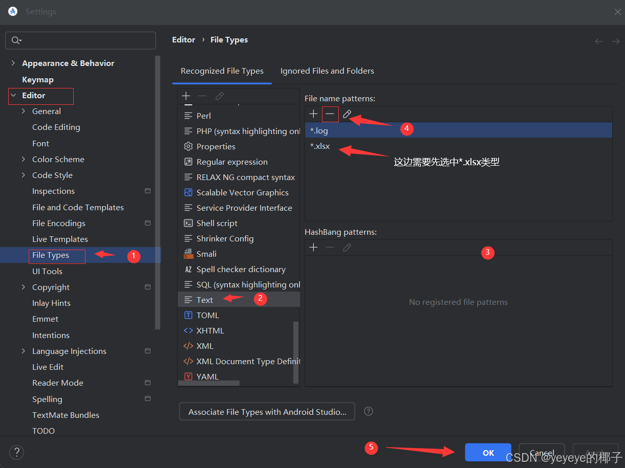 找到Editor→File Types→找到你刚刚选择错误的类型中,会发现有.xlsx类型在其中,(我上面示范的是错误选择了“Text”类型)直接点击删除,再次返回Device Explorer中再次双击.xlsx类型文件,就又会出现情况1中的选项,重新进行选择就好。