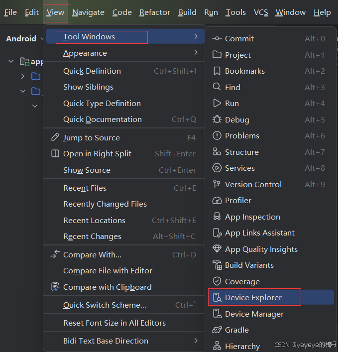 在菜单View中→Tool Windows→Device Explorer点击后,会在右侧出现Device Explorer界面。