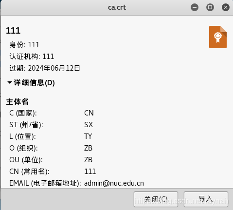 new生成新的,509是标准,days有效时问,key用哪个私钥生成,crt是证书格式 这里提示填写国家名,省,城市,组织名称,组织单位名字,常用的FQDN名称,邮箱地址填好就可以了