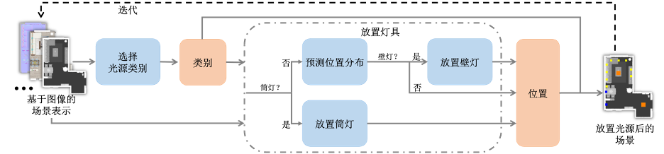我们的自动灯光设计框架使用迭代的方式来进行每个光源的布局与放置。图 3展示了光源布置的流程。我们首先将三维场景使用基于图像的方式进行表示,这种表示包含了场景结构、室内家具、地板、天花板和墙壁的几何信息以及语义信息,同时图像表示也方便了神经网络的学习。
