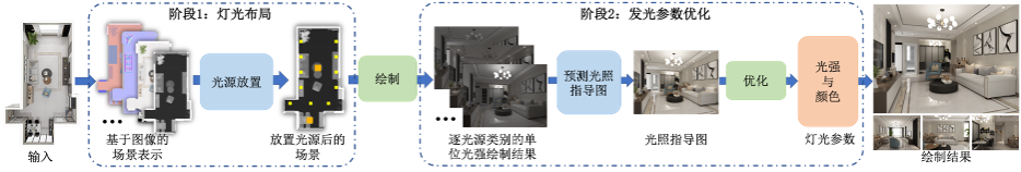为此我们构建了一个包含了6000个专业设计师所设计的三维室内场景的数据集。我们的框架主要包含两个灯光设计的阶段:首先,我们的系统把不同类型的光源逐个放置到室内场景中。其次,我们优化每个光源的发光参数以得到视觉上具有美学考量的光照效果。一系列定性与定量实验表明了我们的系统可以高效的学习到专业设计师的室内灯光设计准则。我们的系统不仅能够取得比当前基于规则的方法更优的结果,而且在多数情况下,能够和专业设计师的灯光设计结果相媲美。在图 1中,我们展示了自动灯光设计系统的总体框架。该成果发表在2023年的《ACM Transactions on Graphics》上。