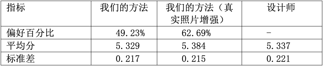 我们使用神经网络图像评价技术对我们的方法进行了进一步的定量验证。实验结果如表 1 使用神经网络图像评价技术得到的美学评价结果所示。从偏好百分比与平均分中可以看出,我们的结果可以获得和设计师相近的结果。同时,经过真实照片增强后的结果在这两个指标上还要优于设计师的结果。