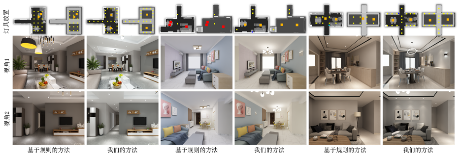 图 6展示了我们的结果和基于规则的方法的结果。第一行展示了光源在自上向下与自下向上视角下观察的布局,第二三行展示了不同自然视角下的结果。可以看到,我们的方法生成的灯具布局更适合场景的已有家具放置与房间布局。不同于基于规则的方法,场景的走廊部分在我们的结果中也被充分照明。同时,我们的用户实验也进一步验证了我们的方法能够取得比基于规则的方法更优的结果。