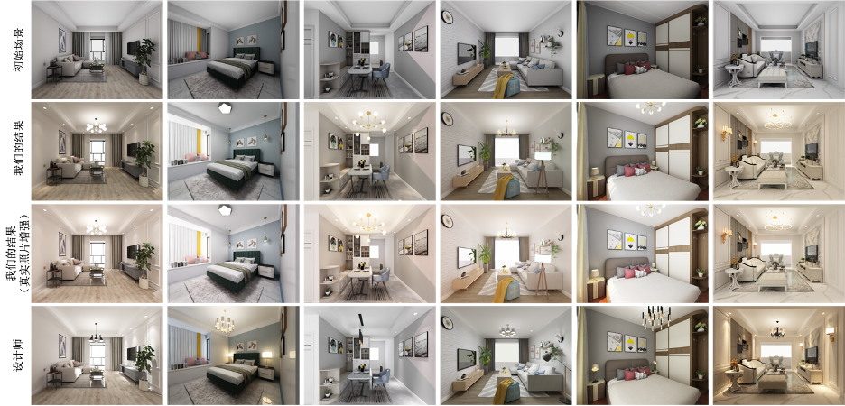 图 5展示了我们的结果和设计师在同场景下的结果。第一行展示了场景在没有进行光源放置时仅使用环境光遮蔽技术进行绘制的结果。第二行和第三行是我们的自动灯光框架生成的结果,其中第三行中的结果引入了真实照片进行了光照效果的增强。第四行展示了同场景下室内设计师得到的光照设计结果。