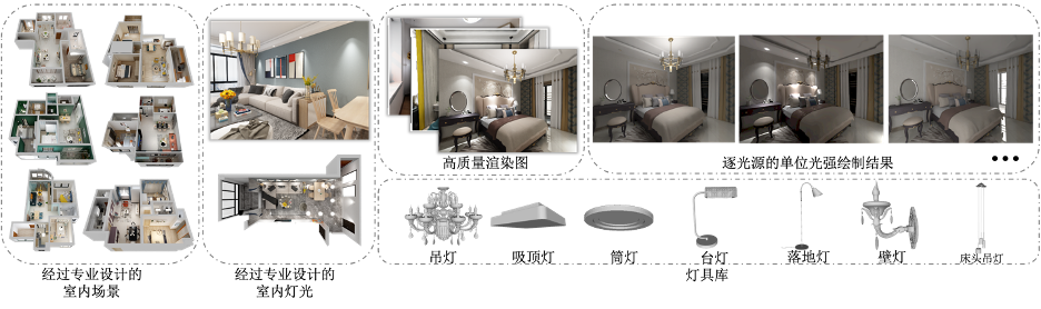 如图 2所示,我们的数据集包含了6000个经过专业设计的室内场景,每个场景的灯光都经过设计师的设计。对于每个场景,我们都绘制生成一系列的渲染图,其中包括了每个光源在单位光强时的绘制结果。除此之外,我们也收集了部分的高质量室内场景真实照片来辅助增强我们的结果。我们把室内场景中的常用灯具分成了七类,构建了一个灯具库,其中每一个灯具模型的发光面都经过了标注。
