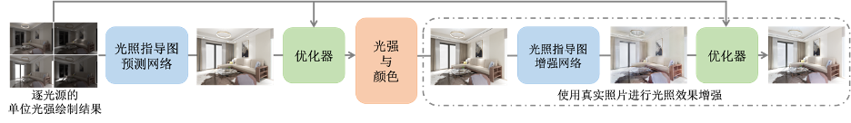在完成了光源的布局之后,我们需要进一步估计出最优的发光参数。图4 给出了我们的系统进行发光参数优化的流程。此流程主要包含两个计算步骤,第一个是使用神经网络来预测一个光照指导图,其代表了此场景进行了合理的照明后的视觉效果;第二个是对具体的灯光参数以之前得到的光照指导图作为目标进行优化求解。除此之外,我们还拓展了此流程从而利用真实室内照片对场景的光照效果进行增强。