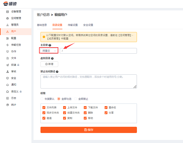 为用户设置刚才配置的阿里云存储,路径为阿里云的主目录路径。