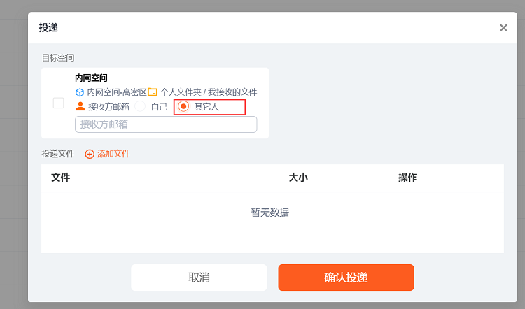 支持将服务器上的文件直接投递传输给系统的其他成员,前提是该成员必须在被投递的空间内才能被投递成功