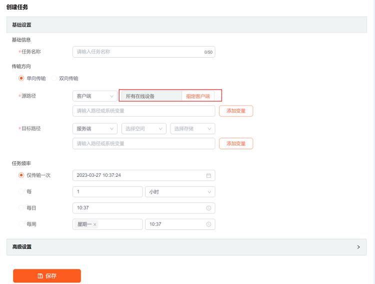 在后管创建服务器任务时,可以指定想要分发的在线节点来进行传输。若未指定,默认会下发给所有的在线节点客户端。