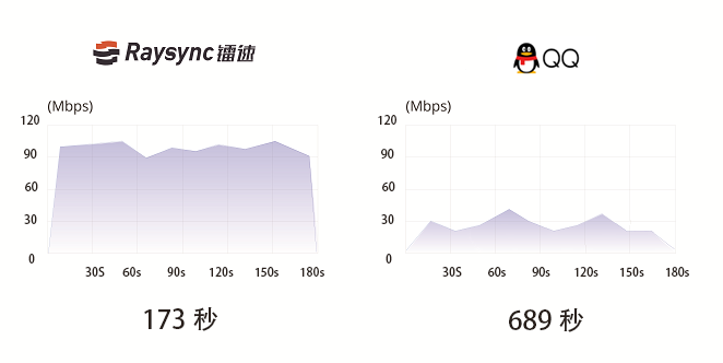 测试结果:2GB文件从深圳传输到北京,QQ点对点传输需要689秒,平均传输速度23.77Mbps;而使用镭速点对点传输,传输速度提升至94.7Mbps,总耗时173秒,相比于QQ传输时间缩减了516秒。同时,镭速追加5GB点对点测试文件,仅花了440秒,整体点对点传输效率得到大大提升。