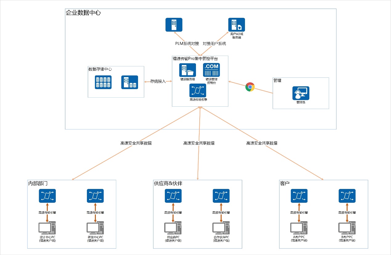 针对制造业数据量大,协同难等特点,镭速在该企业数据中心内部署一套镭速传输系统,与企业现有PLM系统无缝对接,构建以企业自身为中心、与产品、零部件、工艺、工厂、工装等合作伙伴的研发协作、数据发布和数据共享的综合信息系统平台。这一平台可以促进内部研发生产效率,实现数据赋能于企业、业务、管理协同包括经营效能的提升,也增强了企业向外融合——商业交互和交付的能力。
