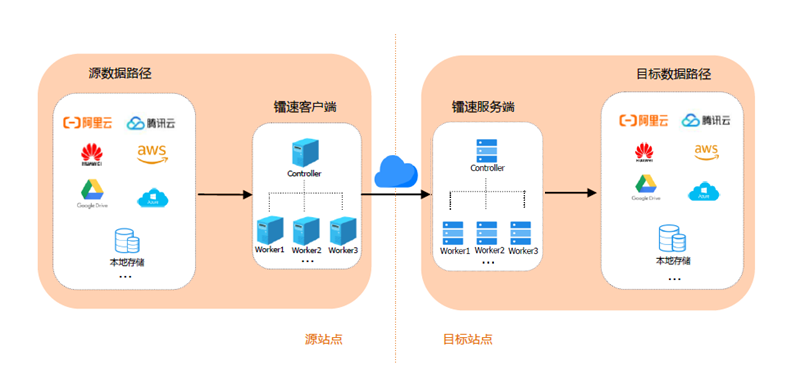 通过多台客户端与多台服务器同时进行数据传输,首先,多台客户端挂载相同的存储(本地存储或对象存储,例如AWS S3),即通过相同的路径,在不同的客户端上都能访问到相同的文件;其次,多台服务端挂载相同的存储(本地存储或对象存储),即通过相同的路径,在不同的服务端上都能访问到相同的文件;配置完成后,在客户端的控制页面创建、管理任务;最后,客户端将一个大的传输任务拆分成以文件为单位的小任务,通过网络将任务信息下发到所有客户端传输节点上,由各节点同时进行传输,加快传输效率。各节点返回各自的传输状态信息,在控制页面就可以进行查看和管理。