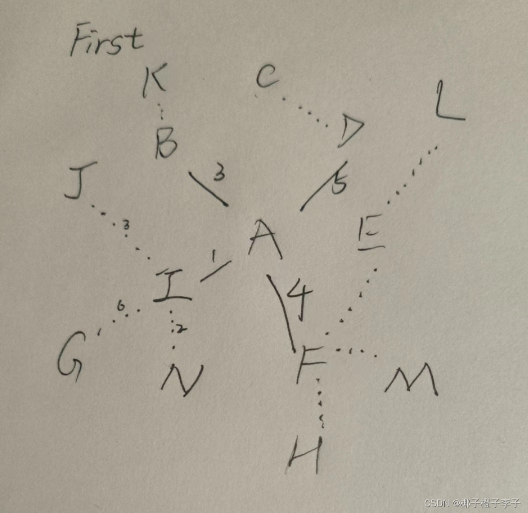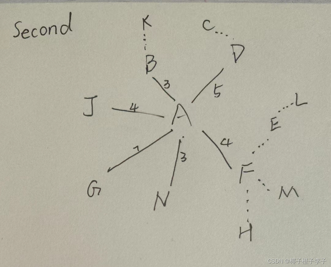 第一步 找到A周围所有直接与他相连的线,并找到权值最小的那个,将这条线记为已经是A到达那一个点(在这里是I点)的最短路径,并且在今后轮到找I点的最短路径时可以不必再找。