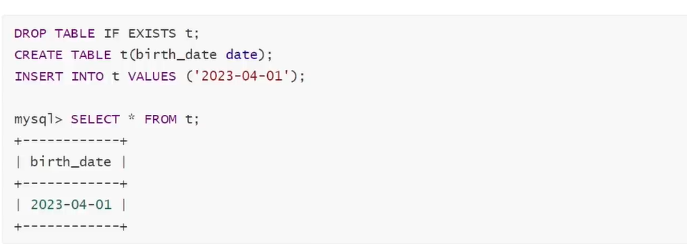 DATE表示日期类型,支持的范围从'1000-01-01'到'9999-12-31',占用3个字节。DATE数据的显示格式为 YY-MM-DD'。例如: