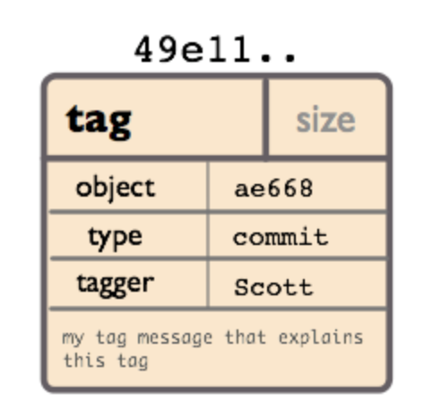 一个标签对象包括一个对象名(译者注:就是SHA1签名), 对象类型, 标签名, 标签创建人的名字(“tagger”), 还有一条可能包含有签名(signature)的消息. 你可以用 git cat-file 命令来查看这些信息: