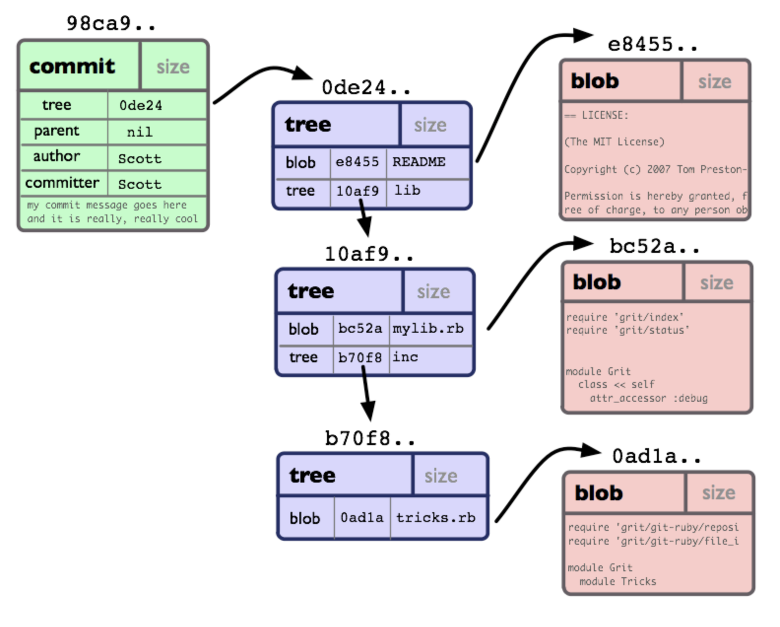 现在我们已经了解了3种主要对象类型(blob, tree 和 commit), 好现在就让我们大概了解一下它们怎么组合到一起的.