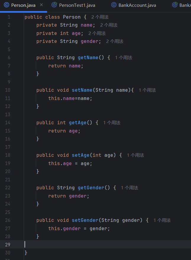 数据隐藏与行为暴露。而在实例中就有所体现:所有属性(name,age,gender)都被声明为private;通过公共的getter与setter方法来控制对这些属性的访问。