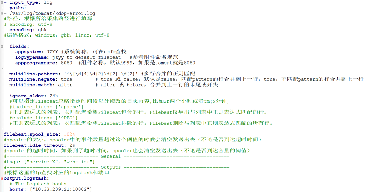 具体的一个yml采集配置样例如下:该配置文件是filebeat采集数据的依据,并根据需求添加必要配置,filebeat收集日志后发往logstash,配置如下: