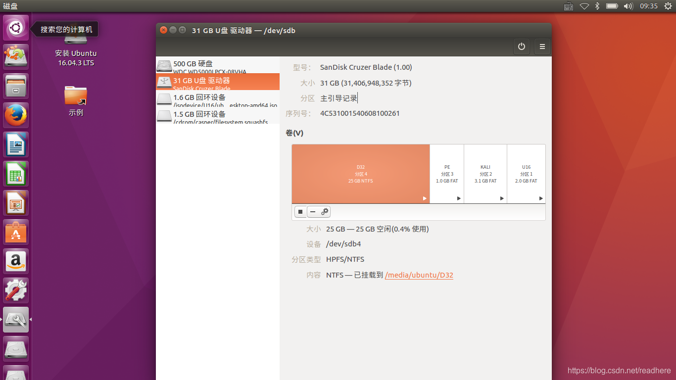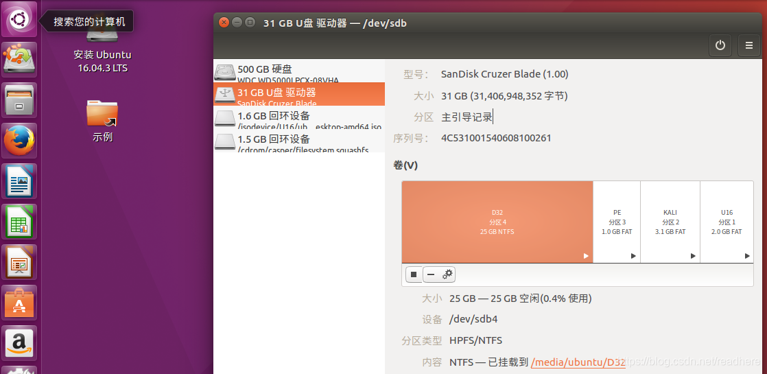 经过测试,这些启动项都可以顺利地启动,比如Ubuntu 16.04,启动后我们可以看到U盘的分区情况: