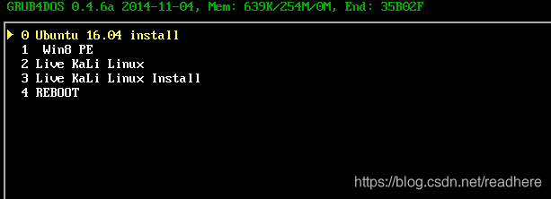 完成制作4分区的启动U盘后,用其启动电脑,可以看到如下的GRUB4DOS启动菜单,这些启动项分别来自三个不同的分区: