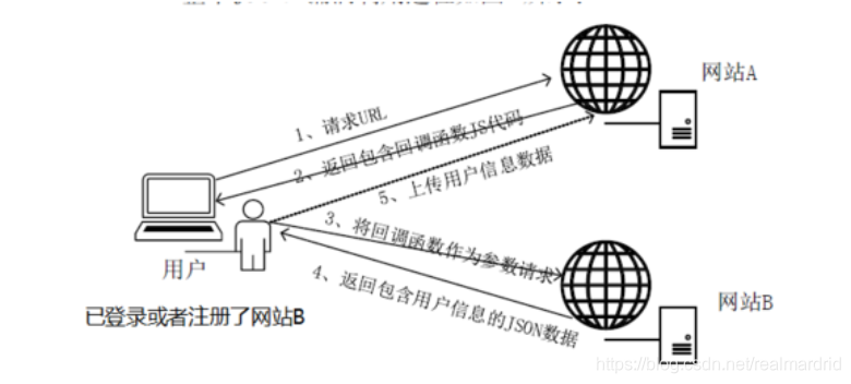 4、用户收到响应,解析JS代码,将回调函数作为参数向网站B发出请求;