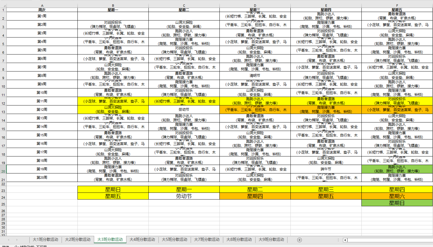 上学期做过一次大班运动场地安排,跳过节日。2023.2下学期运动场地排班(跳过节日)又来了。
