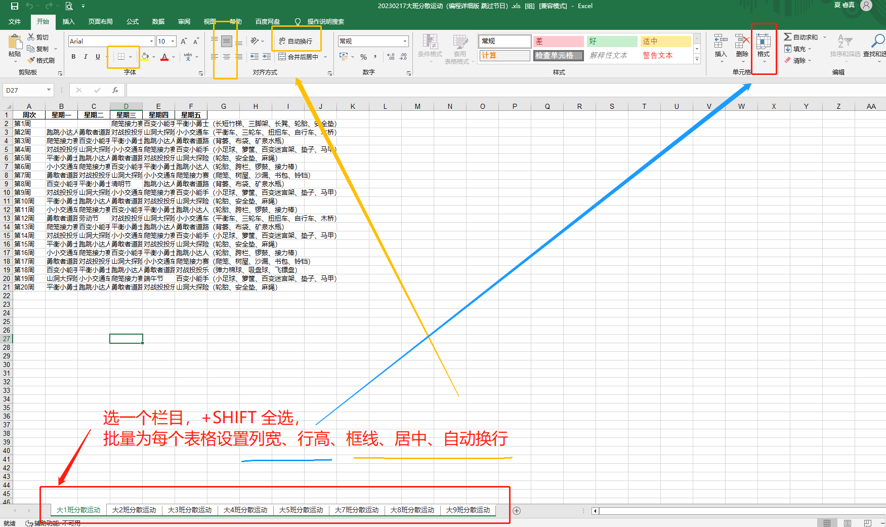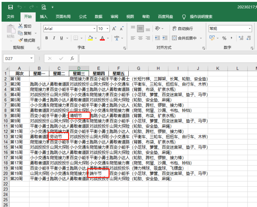 上学期虽然程序批量生成了跳过节日的运动场地,但是涉及到节日的部分内容还是需要手动调整。(而且是1个班级的手工剪切复制)