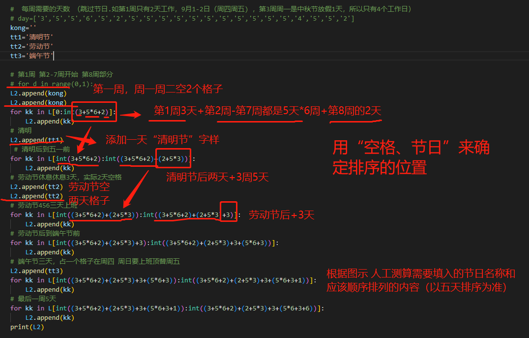 本代码解决的重点——跳过节日,并补全节日名称,每周正好5个