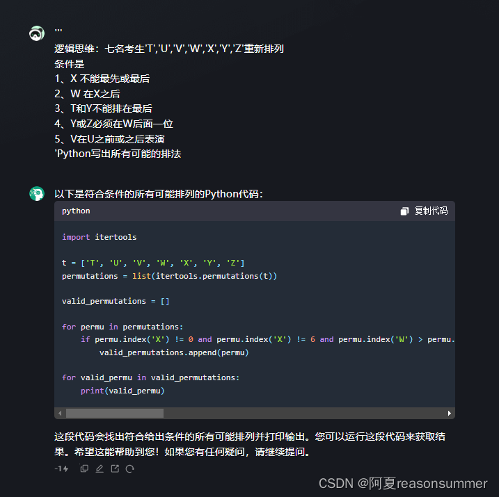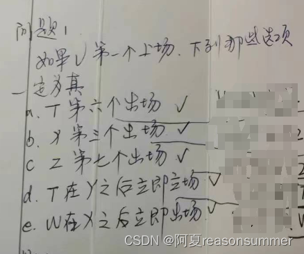 2024年3月22日得到发布测试题,作者用Python代码解题。通过排除法获72种符合问题0的答案,又分别提取第1个字母是V和第3个字母是U的排列组合。最终得出题目0、1、2的结论,如题目1中仅一个排列符合所有选项等。