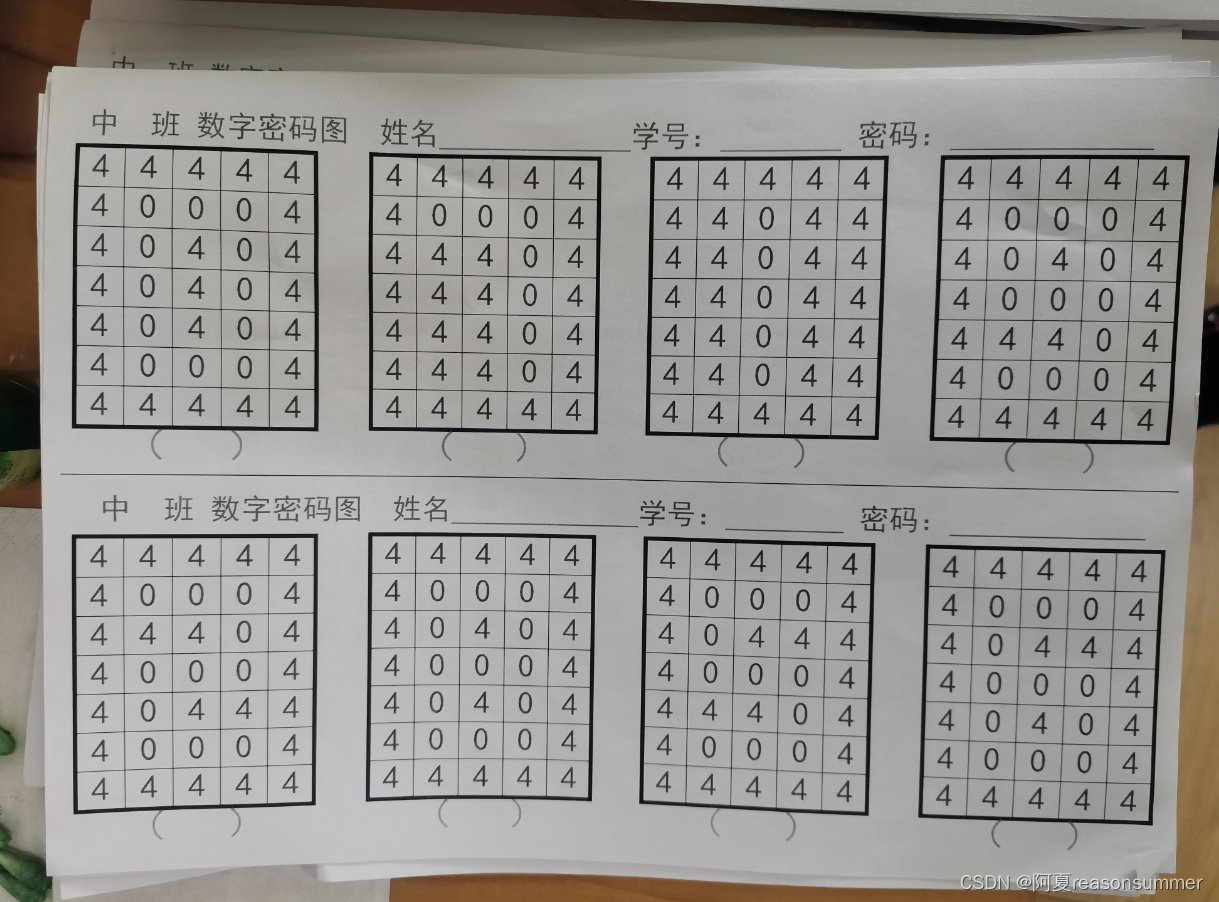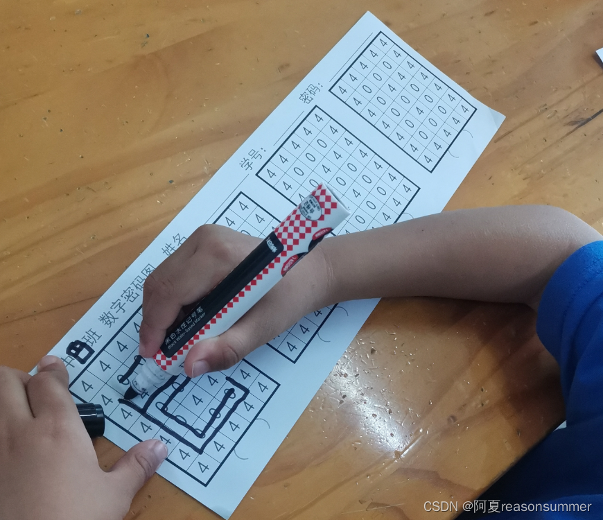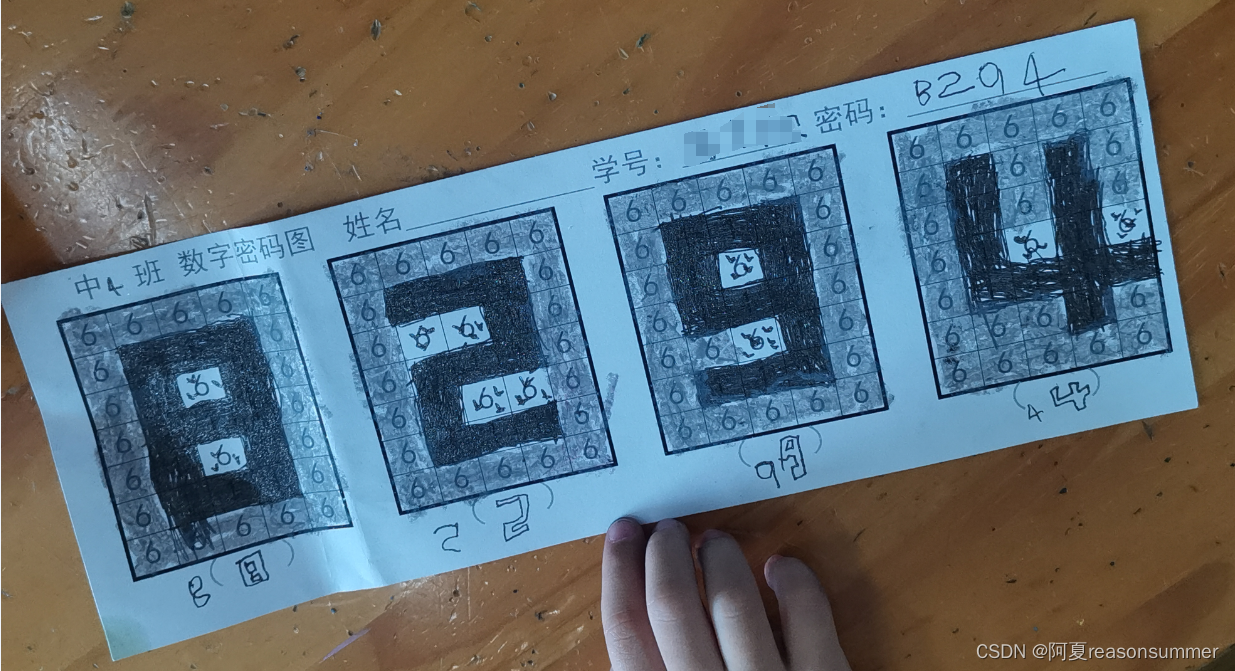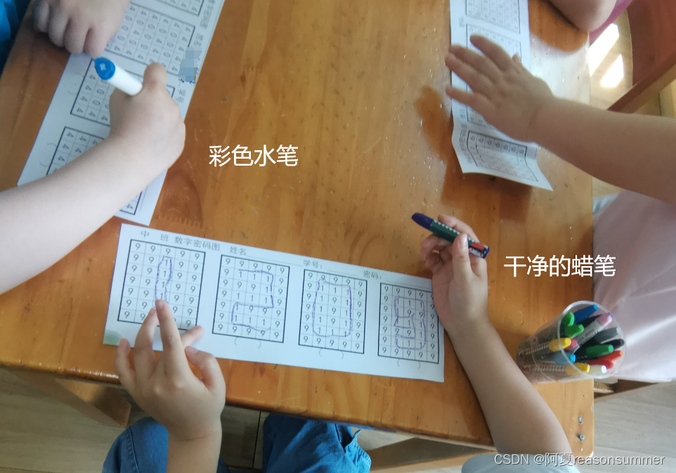 背景需求: 【教学类-13-04】20230404《数字色块图+判断密码是否正确-5*7*8-A4横板-横切》(中班主题《我爱我家》)_图案密码色块-优快云博客文章浏览阅读530次。【教学类-13-04】20230404《数字色块图+判断密码是否正确-5*7*8-A4横板-横切》(中班主题《我爱我家》)_图案密码色块https://blog.youkuaiyun.com/reasonsummer/article/details/129931679 时隔一年(2023年中6班),再次打印以上这套学具,给中4班的孩子试一试破译密码。 教学实践: 班级:中4班 人数:23人 时间:2024年6月4日 一、会写名字的人数 二、两位幼儿尝试 (用点兵点将的口诀,从左排向右排,随机选择了第10个举手的孩子) 三、自选绘画材料 还有铅笔、黑色记号笔、水笔荧光笔、蜡笔等。 四、幼儿破译密码