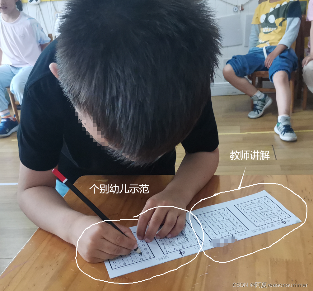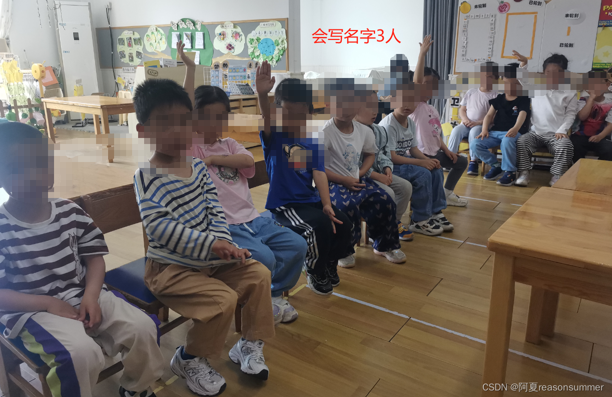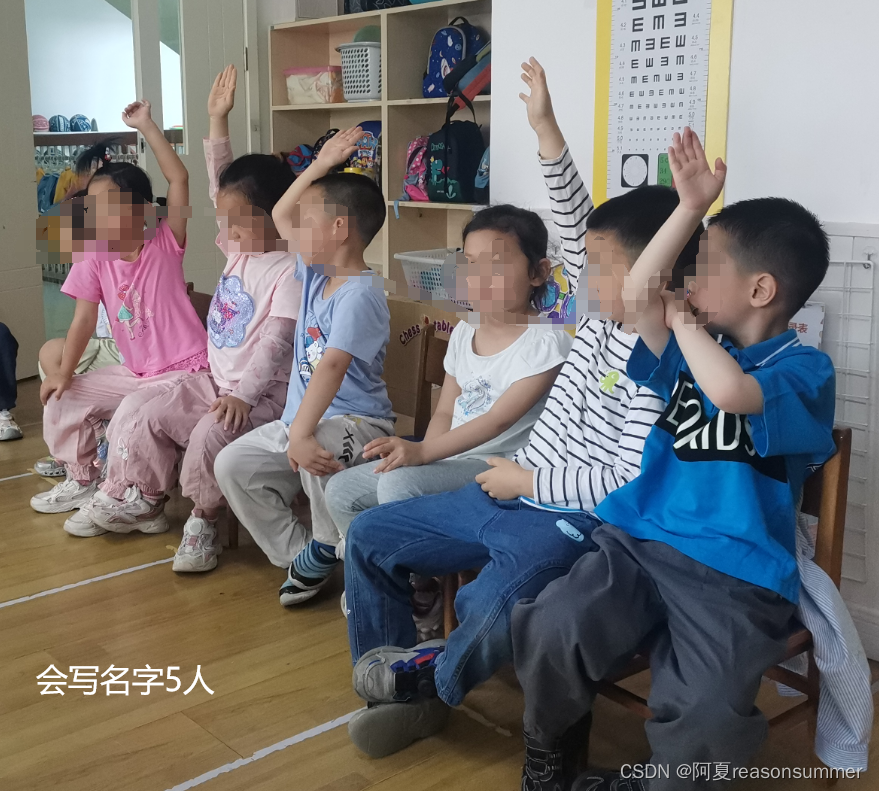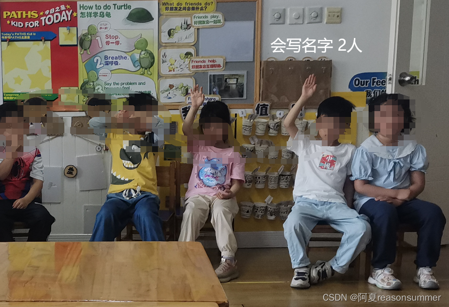 背景需求: 【教学类-13-04】20230404《数字色块图+判断密码是否正确-5*7*8-A4横板-横切》(中班主题《我爱我家》)_图案密码色块-优快云博客文章浏览阅读530次。【教学类-13-04】20230404《数字色块图+判断密码是否正确-5*7*8-A4横板-横切》(中班主题《我爱我家》)_图案密码色块https://blog.youkuaiyun.com/reasonsummer/article/details/129931679 时隔一年(2023年中6班),再次打印以上这套学具,给中4班的孩子试一试破译密码。 教学实践: 班级:中4班 人数:23人 时间:2024年6月4日 一、会写名字的人数 二、两位幼儿尝试 (用点兵点将的口诀,从左排向右排,随机选择了第10个举手的孩子) 三、自选绘画材料 还有铅笔、黑色记号笔、水笔荧光笔、蜡笔等。 四、幼儿破译密码