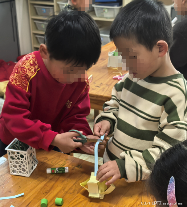 最后没有人喊了,我拍了几张,一些能干的孩子找不到老师解决(老师忙死,不理他们),就自己研究或和同伴商议了。最后还真的做出来了。