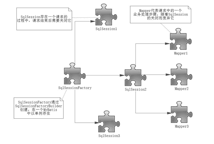 - 如果说 SqlSessionFactory 相当于数据库连接池,那么 SqlSession 就相当于一个数据库连接(Connection 对象),你可以在一个事务里面执行多条 SQL,然后通过它的 commit、rollback 等方法,提交或者回滚事务。所以它应该存活在一个业务请求中,处理完整个请求后,应该关闭这条连接,让它归还给 SqlSessionFactory,否则数据库资源就很快被耗费精光,系统就会瘫痪,所以用 try…catch…finally… 语句来保证其正确关闭。