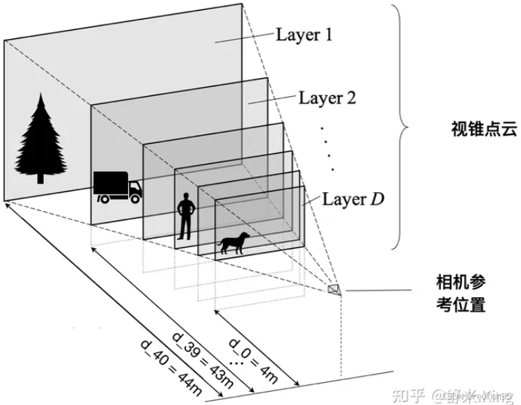有了C*D*H*W的点云特征后,我们可以通过内参矩阵将图像域下的点云特征转换到各个相机的相机坐标系下,LSS中定义的深度范围为4m到44m,间隔为1m,这样每个图像特征点有D=41个可能的离散深度值,在相机域下,点云特征的形状类似于截锥体,因此我们称之为截锥点云。