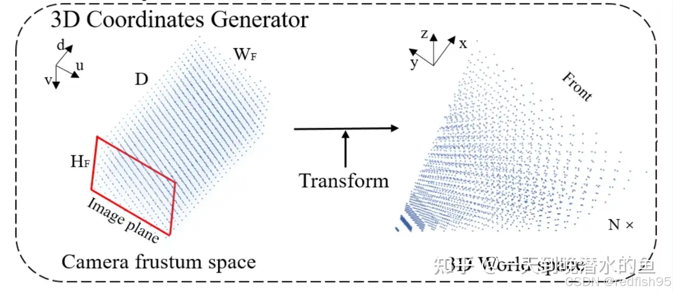 该函数的作用是在图像域建立一个维度为D*H*W的点云,用于后续的计算,如下图的左边所示。