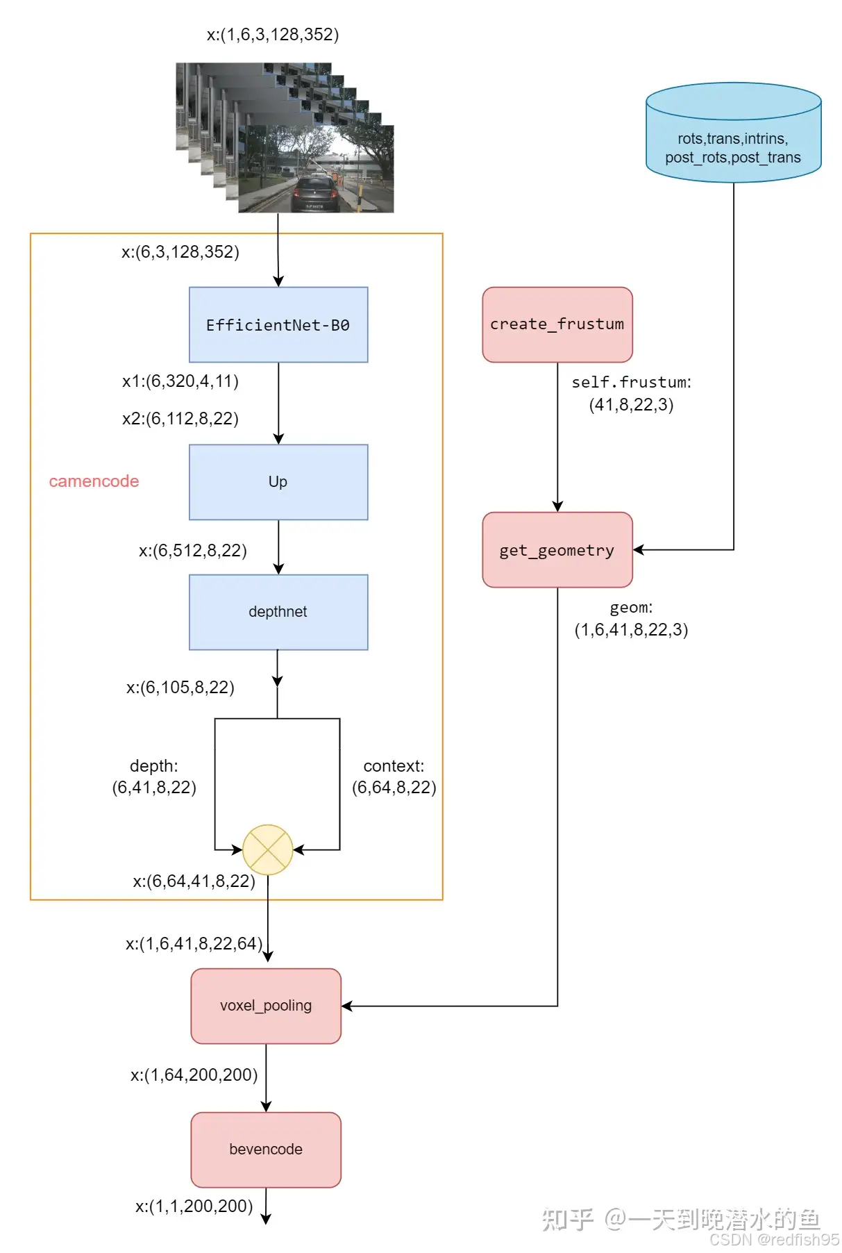 调用depthnet,其中只有一层卷积,将512维变为D+C维,其中D是41,即上面的深度个数,C是特征维度,64。将该特征图按通道维度分为两部分,depth为前41个通道,进行softmax,后64通道就是图像得到的特征,将两者相乘,得到新的new_x,维度为B*N*64*41*H*W,相当于41个深度对应的概率来加权特征,代表处于每种可能的深度时,对应的经过加权的64维特征。