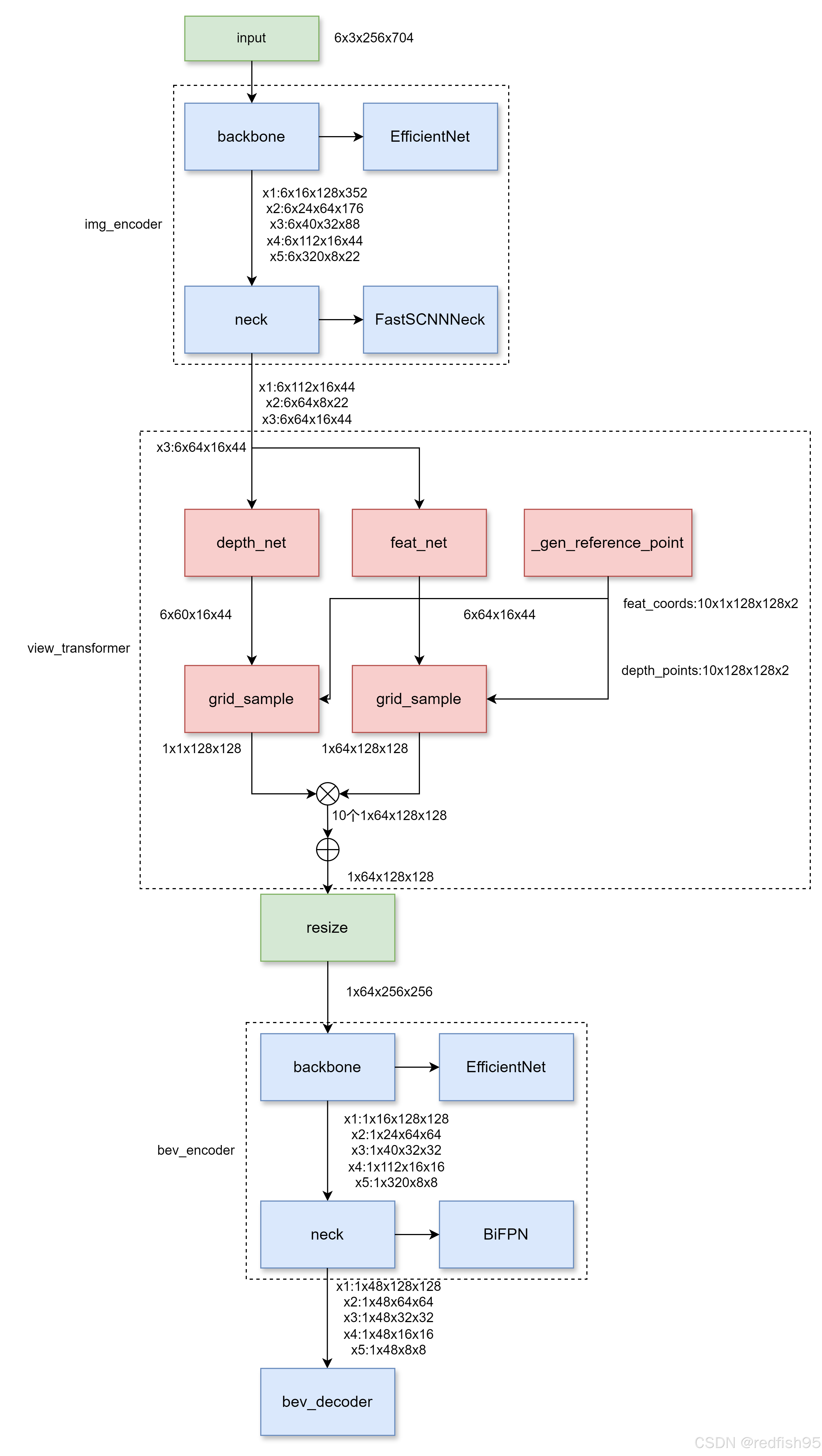 在get_depth_feat函数中,通过get_eff_depth得到图像的特征图,输入的尺寸为B*N*3*H*W,得到B*N*512*H*W尺寸的特征图。