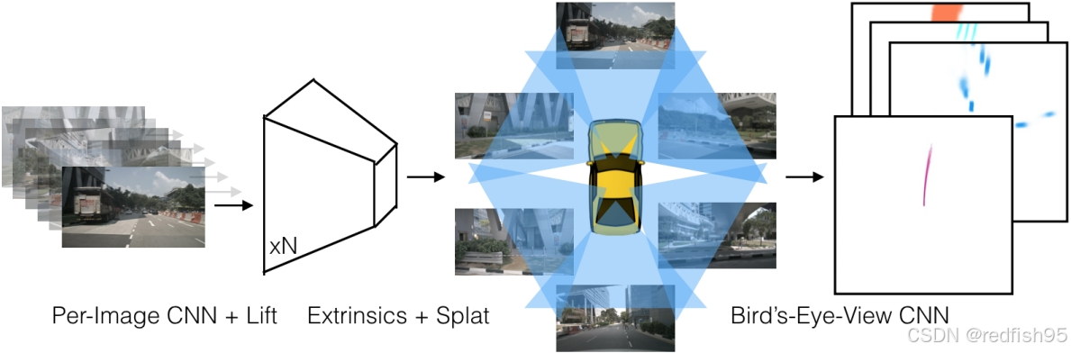 文章作者提出了一种端到端架构,该架构可以从任意数量的相机中直接提取给定图像数据场景中的BEV表示,其核心思想是将每张图像单独“提升(Lift)”到每个相机的视椎体中,然后将所有视椎体“溅射(Splat)”到格栅化的BEV网络中。最后一个S表示“Shoot”,该环节与运动规划有关而与感知无关,在此不作介绍。