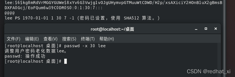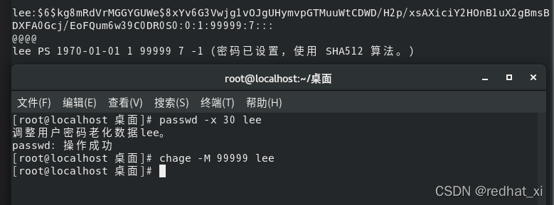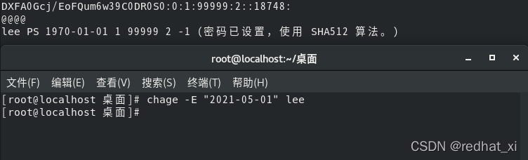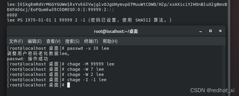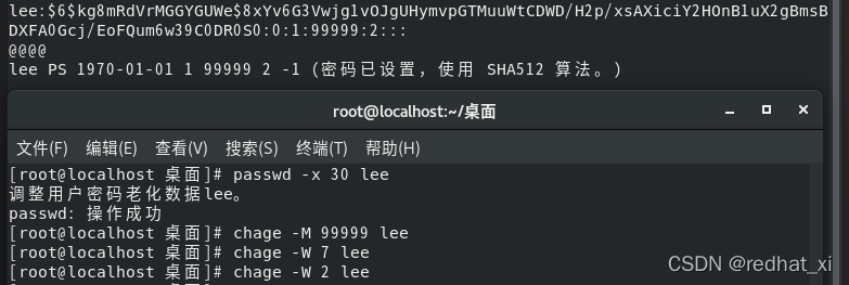 [root@localhost 桌面]# watch -n 1 "tail -n 1 /etc/shadow;echo @@@@;passwd -S lee"